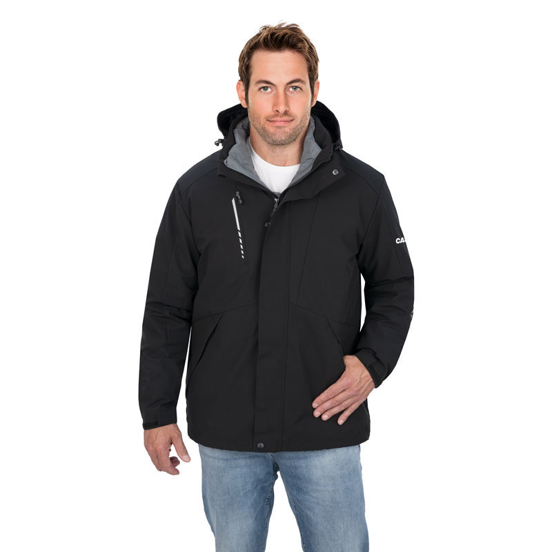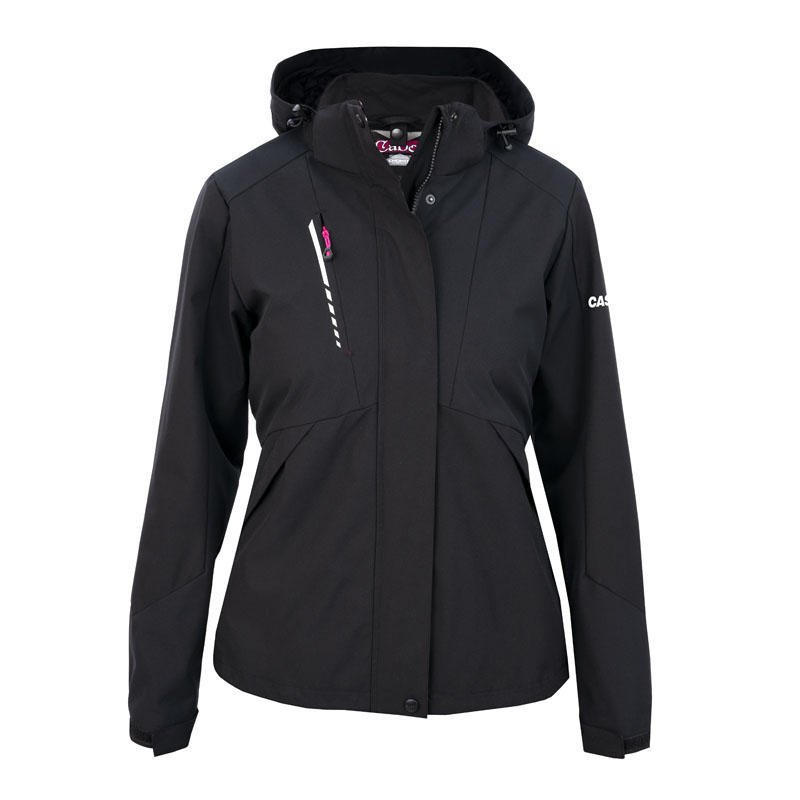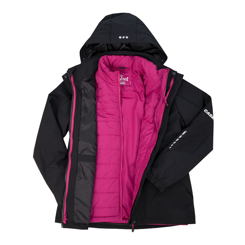 *Outer Jacket: *100% Polyester stretch fabric *100% Nylon lining *Water & wind resistant *Three exterior zippered pockets *Removable, adjustable hood *Double storm flap with chin guard *Adjustable hem & cuffs *Reflective accents *YKK® center front zipper *Flattering fit
